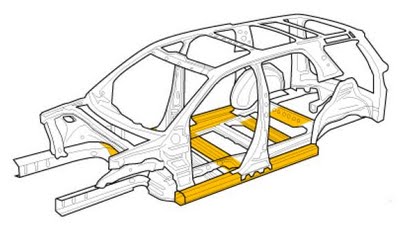 First off, Martensitic is a Ultra-high Strength Steel (UHSS). I will throw a little automotive talk into my update today. Many automakers use the same platform to built different model for each of their different brands. General Motors has a platform that is used throughout all of their brands called the Lambda platform. The Lambda platform is used on the Saturn Outlook, GMC Acadia, Buick Enclave, Chevrolet Traverse, and the Cadillac SRX. General Motors uses Martensitic steel in the outer rocker panel and vehicle underbody on the Lambda body structure. Look at the image below and the yellow parts are Martensitic steel.