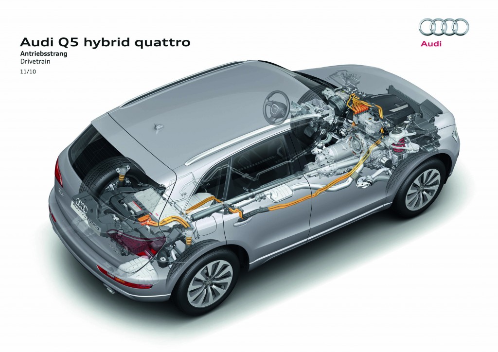 The 2011 Audi Q5 Hybrid Quattro has an extremely light body structure with the rear hatch and engine hood made of aluminum. The rigid body shell incorporates hot-shaped steel in numerous places, combining low weight with extremely high strength. Despite an extensive array of standard equipment, the Q5 Hybrid Quattro with its curb weight of less than 2000 kg (4,409 lb) is the lightest hybrid SUV on the world market.