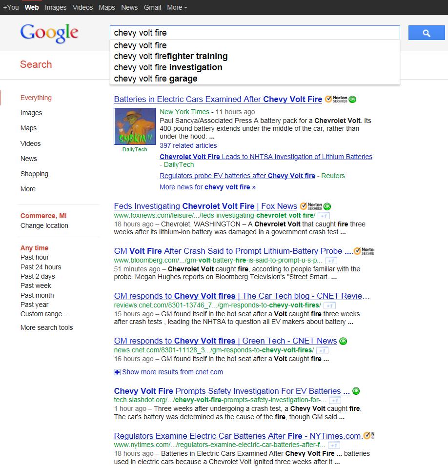 The headline that started making the rounds thru the news networks was “Chevrolet Volt catches fire after crash”. Just look at the web search below! What you have to read into the story is the Chevrolet Volt caught fire in storage more than three weeks after a government crash test. That’s right three weeks after the test. The first news report I heard completely left out that it happened three weeks after the test. So what is your first thought, the Volt was crashed and burst into flames. However that was clearly not the case. The fire prompted federal safety regulators to look at safety procedures for electric vehicles after a crash. Not to look at an electric car that burst into flames after a crash test. General Motors has responded to this incident by stating the NHTSA did not follow GM’s recommended safety protocol for a post-crash Volt.