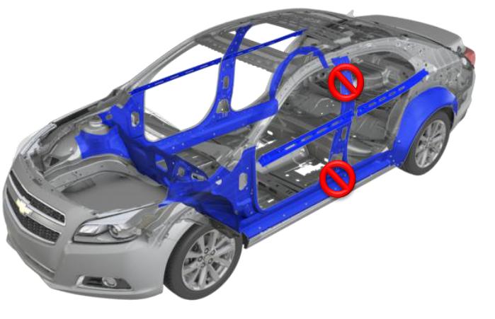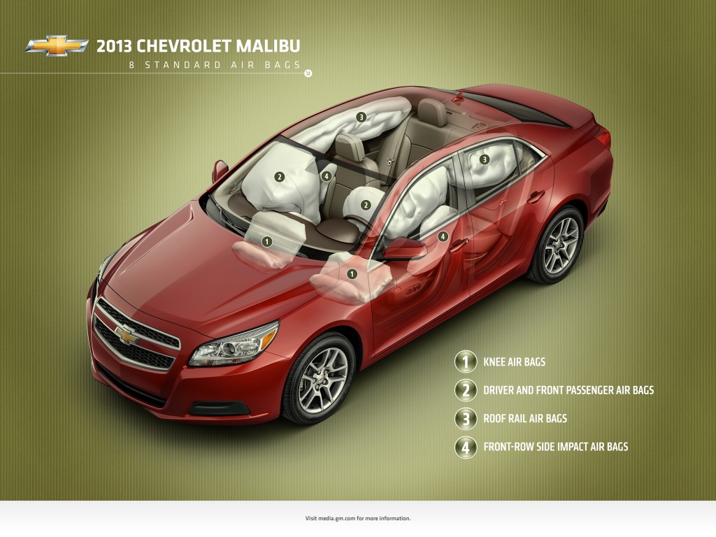 The Chevrolet Malibu Eco is designed to protect the occupants during a collision. The body structure contains high strength steel; this is highlighted in blue. The occupants are protected from front, rear, and side impacts by a structural cage created by the underlying vehicle structural design. Additional crumple zones protect the occupant with front, side, and rear rails that are designed to crush in a crash.