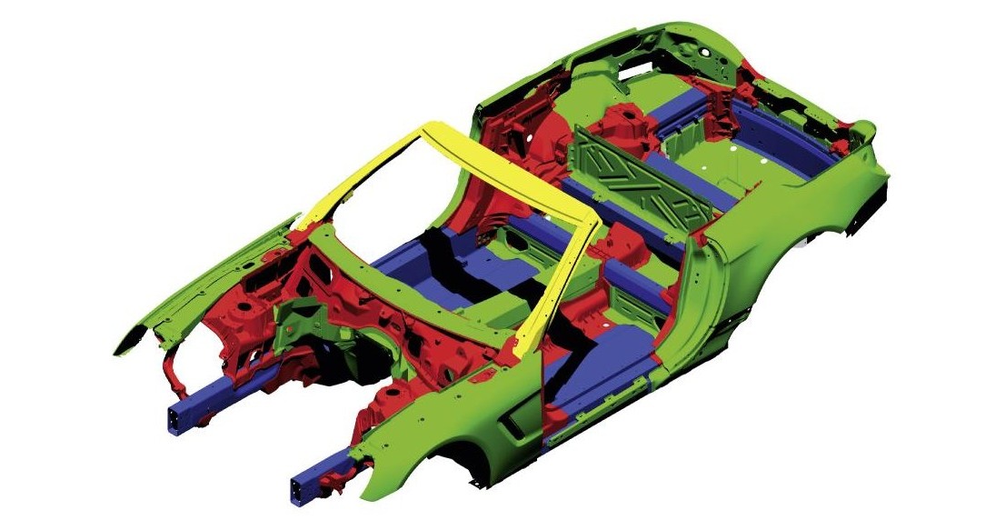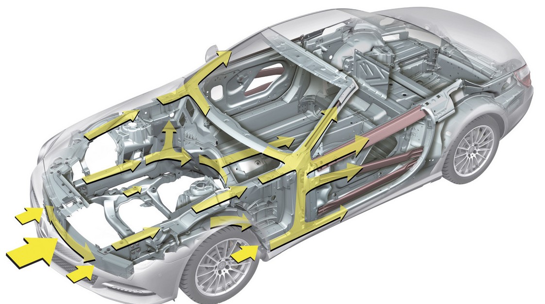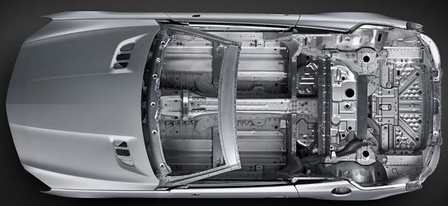 The 2013 Mercedes-Benz SL-Class Body Structure, which is predominantly aluminum, plus a few magnesium parts here and there, along with some high-strength steel placed judiciously for a rigid and safe structure. Taking this and other heft-shedding ploys into account, Benz claims a 2013 SL550 will be around 310 pounds lighter than its predecessor.