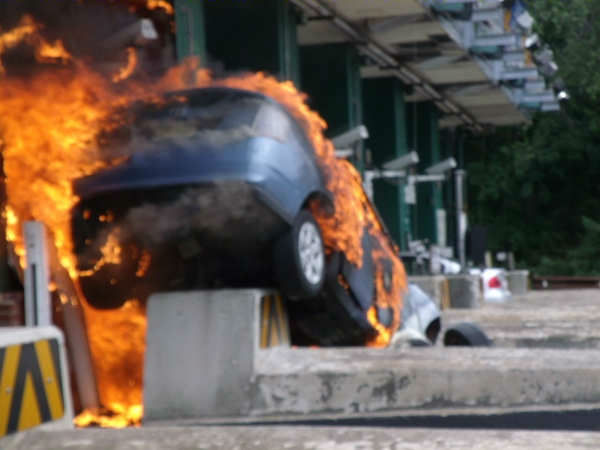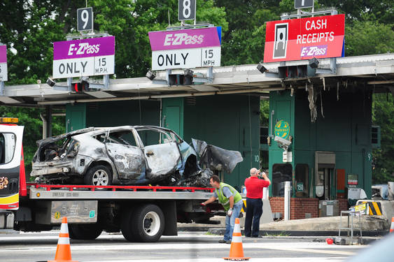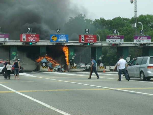 New Jersey highway officials say two cars were involved in an accident at a Garden State Parkway toll plaza that resulted in a car hitting a toll booth and bursting into flames. State Police Sgt. Brian Polite says a Toyota Prius driven by 86-year-old Ralph Schiller of Fort Lee was approaching the Bergen Toll Plaza in Saddle Brook around 3:30 p.m., when it side-swiped a Honda Accord driven by Kristie Frost of Pasadena, Md. Police say Schiller’s car continued forward and struck a barrier and a toll booth, and the booth and car both caught fire.