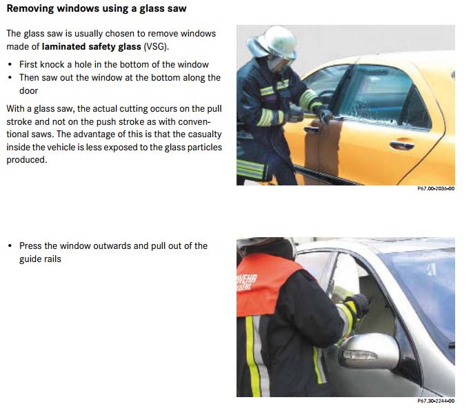 Here is a quick tip from the Merecedes Benz Rescue Guide about removing laminated side glass in vehicle doors. A saw is what first comes to mind to remove laminated glass, and that works well in this case. So pick your hand tool, grab a Extrication Tomahawk or GlasMaster and knock a hole in the bottom of the window, saw out the bottom of the window at the bottom along the door, and then press the window outwards and pull it out of the guide rails.