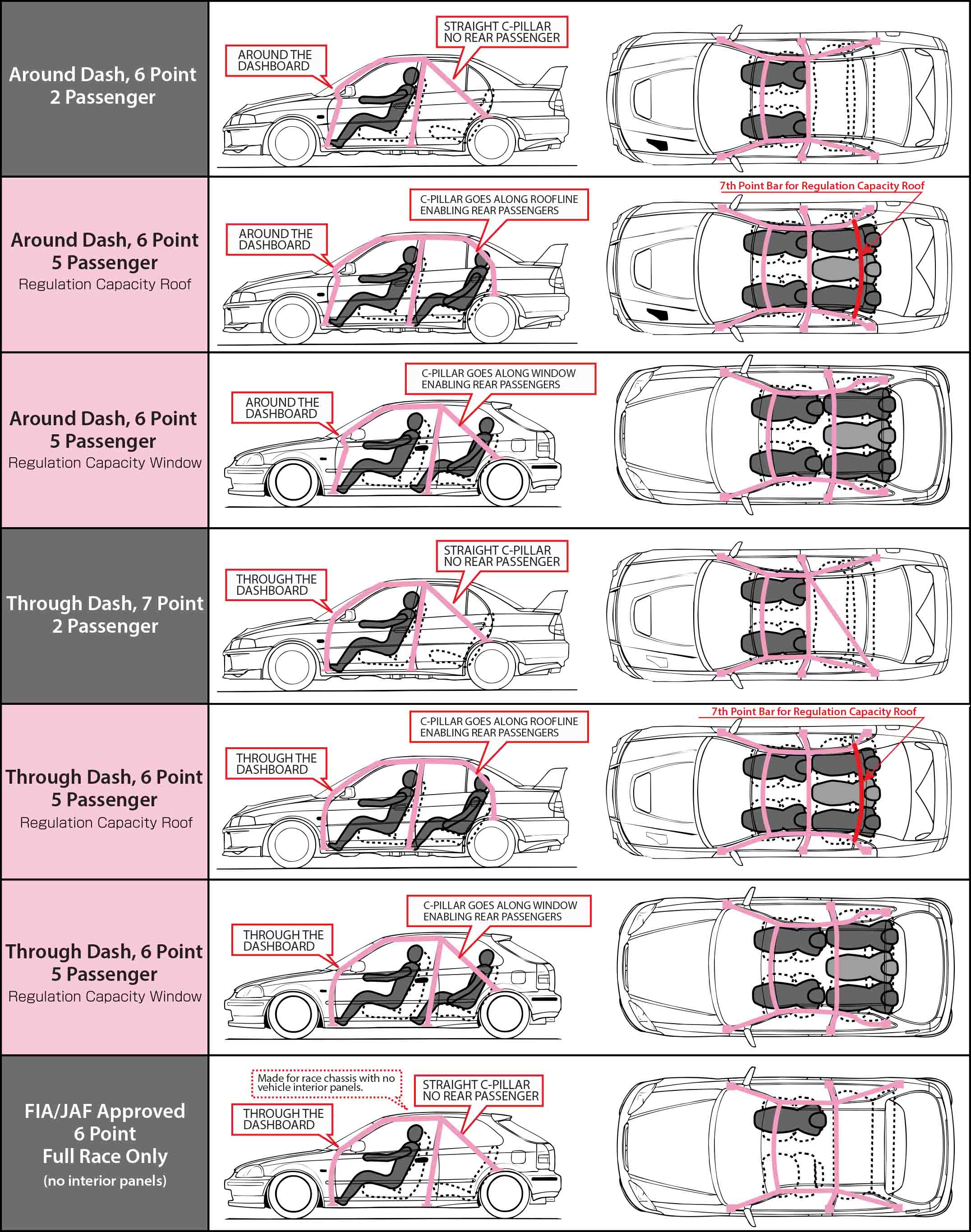 Rollcages may be required and need to comply with certain FIA sanctioned races. They are designed to protect the occupants during a vehicle roll-over. The chassis also becomes significantly rigid to promote better handling characteristics. Full FIA WRC weld-in cages and bolt-in cages are also available. Take a look at the variation chart below for different types of rollcages.
