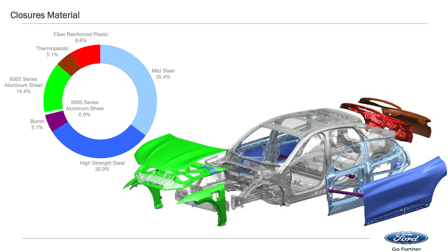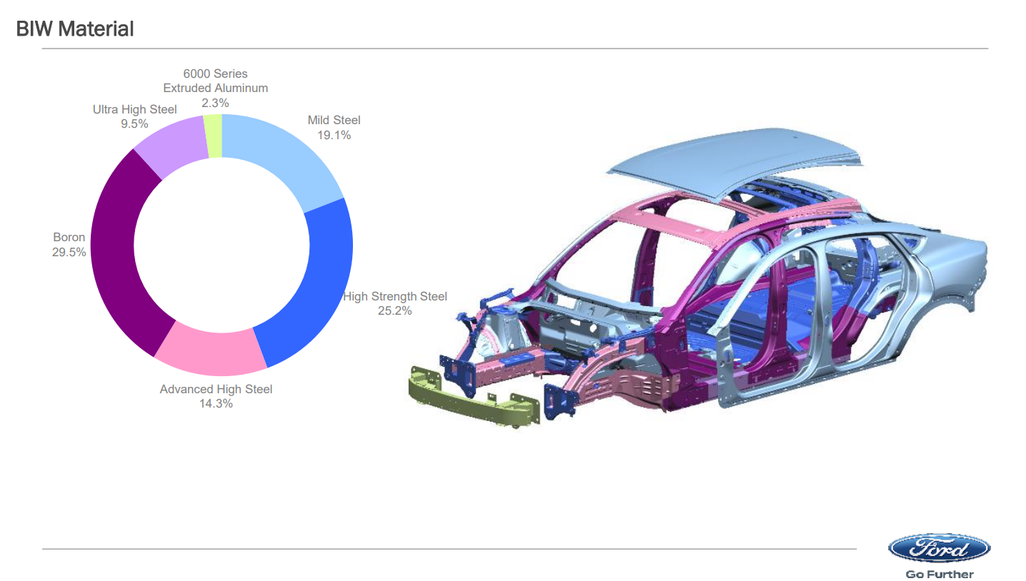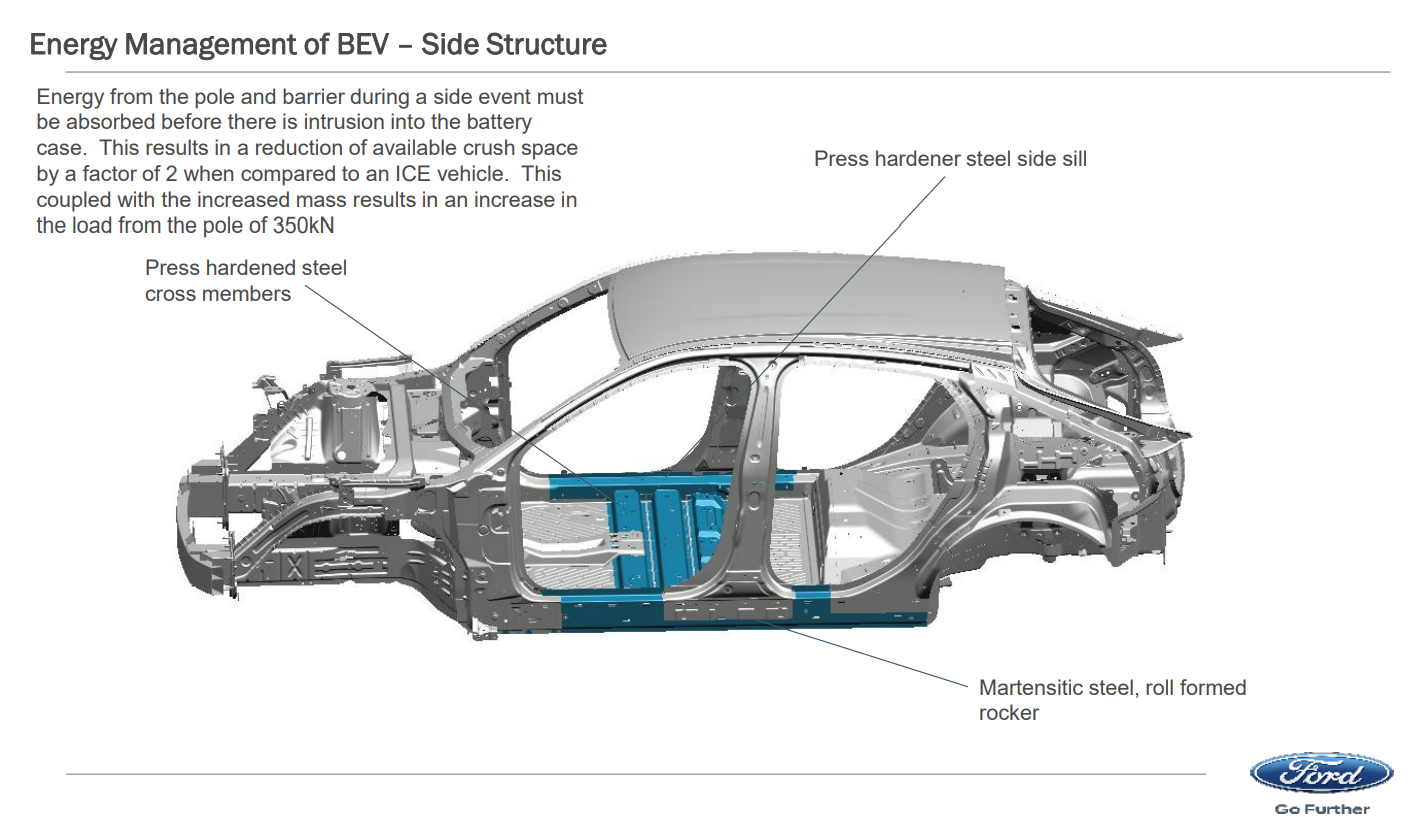 The 2022 Ford Mustang Mach E is a completely electric vehicle. One trend among Battery Electric Vehicles (BEV) is strong steel in the rocker panels and other areas to protect the battery pack. The martensite and press hardened steels we commonly find in the B-pillars are used in the rocker panels. Take a look at the images below presented in the 2021 Great Designs In Steel event last May.