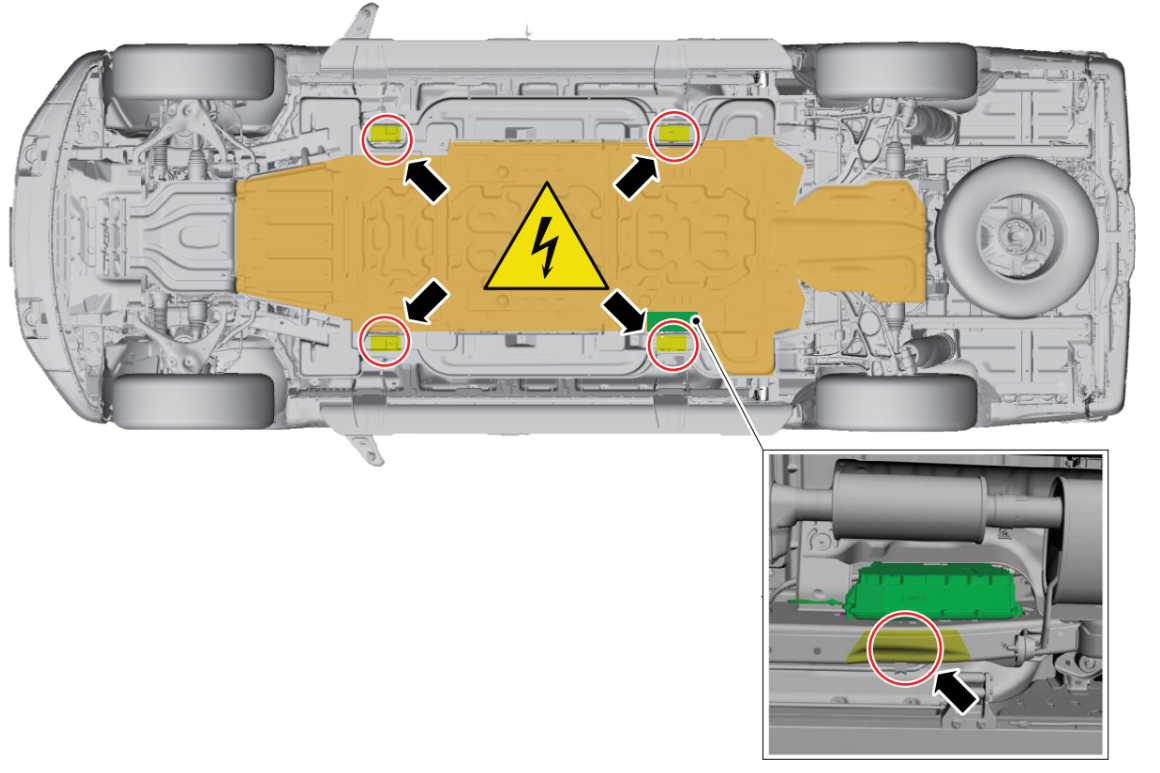 Just like any other EV, the manufacturer wants us to utilize the lifting points on the frame for stabilization. We can use other locations on the vehicle, you need to make sure that any cribbing or struts do not contact the battery pack or push, strain, or move it. This is extremely important when using struts on a side-resting vehicle. However, the underside of this truck still leaves plenty of options for strut use.
