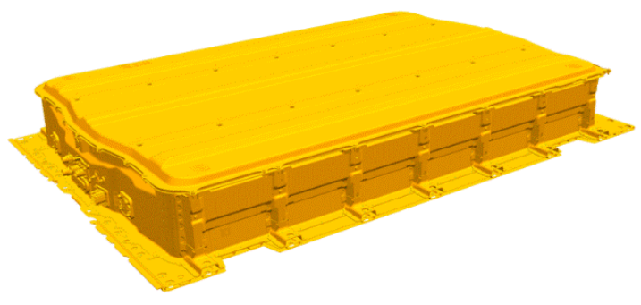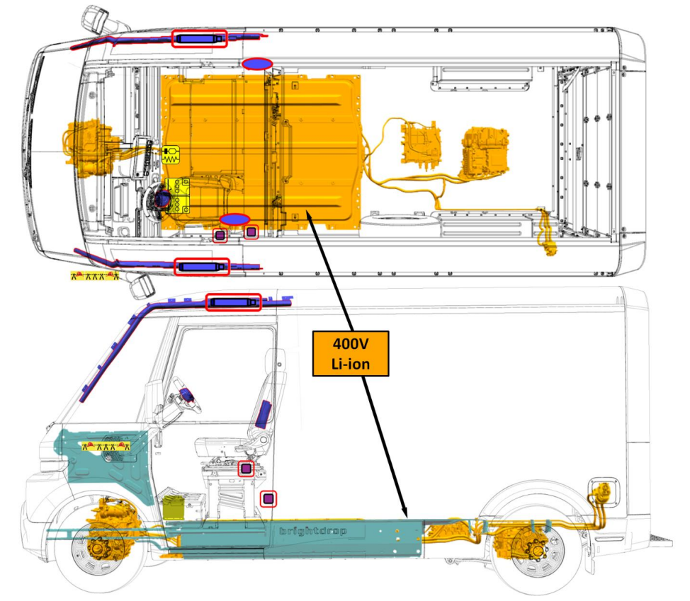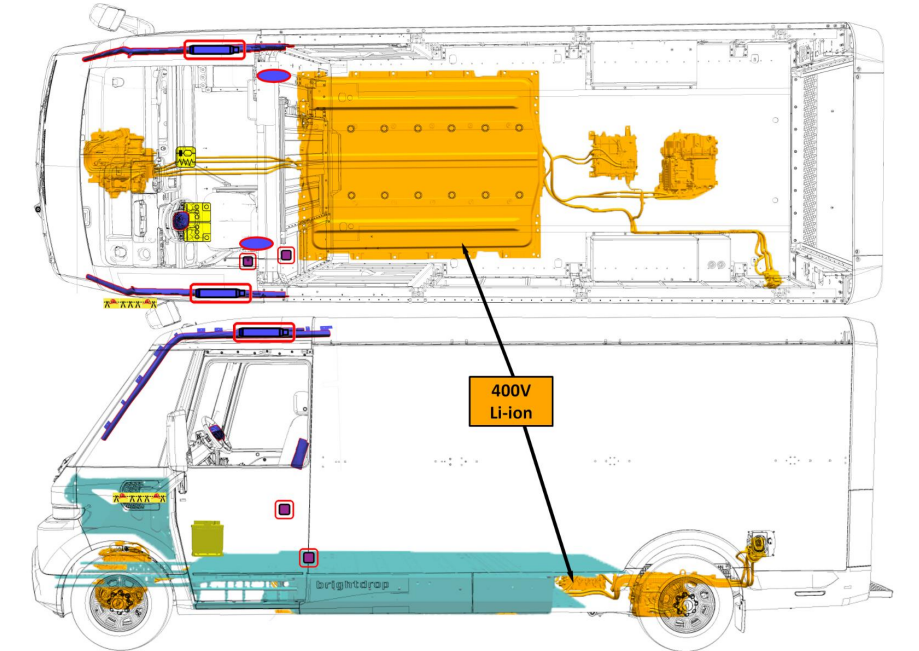 The BrightDrop Zevo 600 electric van has a 20-module Ultium battery pack. The battery is a High Voltage (Class B) Li-ion pack, that is a mounted under the vehicle and is a structural part of the floor pan.